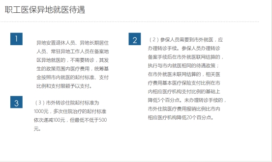 城乡居民医保:参保人员需要到市外就医,应办理转诊手续。参保人员办理转诊备案手续后在市外就医联网结算的,执行与市内就医相同的待遇政策;在市外就医未联网结算的,相关医疗费用基本医疗保险支付比例在市内相应医疗机构支付比例的基础上降低5个百分点。未办理转诊手续的,市外住院医疗费用报销比例比市内相应医疗机构降低20个百分点。